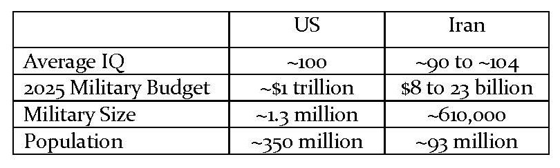 Racist that I am, I confess I was a bit surprised by the upper end of Iran’s IQ ranking. But the rest of the numbers did not bode well for Iran. Of course, when one does these sorts of comparisons, there’s always a proviso: “Other things being equal, Iran doesn’t have a chance against America in terms of military spending, military size, and population.”